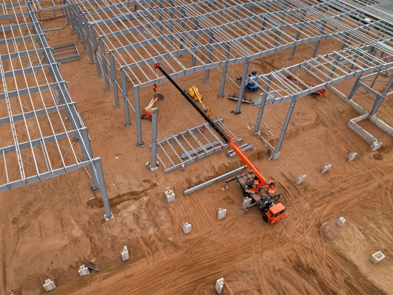 Các thành phần thép, bao gồm dầm, cột, niềng răng và vì kèo trên mái, được đúc sẵn trong môi trường nhà máy. Thép chất lượng cao được sử dụng và các thành phần được sản xuất cho các thông số kỹ thuật chính xác để đảm bảo chúng khớp với nhau một cách chính xác và an toàn trong quá trình cài đặt. Môi trường được kiểm soát này cho phép các biện pháp kiểm soát chất lượng nghiêm ngặt, đảm bảo độ bền và độ tin cậy của các thành phần.