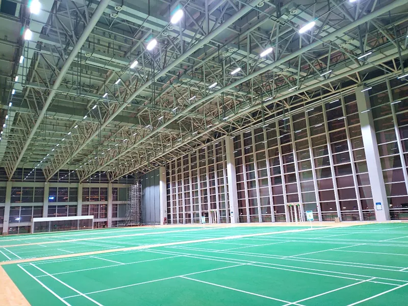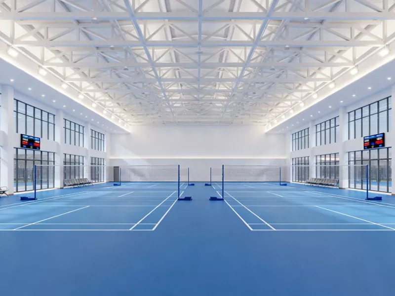 Dưới sự phát triển của các tòa nhà thể thao hiện đại, nhà thi đấu cầu lông kết cấu thép đã dần trở thành hình thức kết cấu được ưa chuộng trong việc xây dựng các địa điểm cầu lông. Khung chính bao gồm dầm thép và cột thép có tính đến độ bền kết cấu, hiệu quả thẩm mỹ và hiệu quả kinh tế, thể hiện tiêu chuẩn của các địa điểm thể thao chuyên nghiệp. Là một địa điểm khép kín nên phòng cầu lông cần có hệ thống thông gió tốt và có tác dụng cách nhiệt. Nhà thi đấu cầu lông kết cấu thép có thể sử dụng vật liệu tường cách nhiệt, thân thiện với môi trường hơn, đồng thời có thể lắp đặt các tấm pin mặt trời trên mái nhà để tạo ra điện cho hệ thống thông gió.